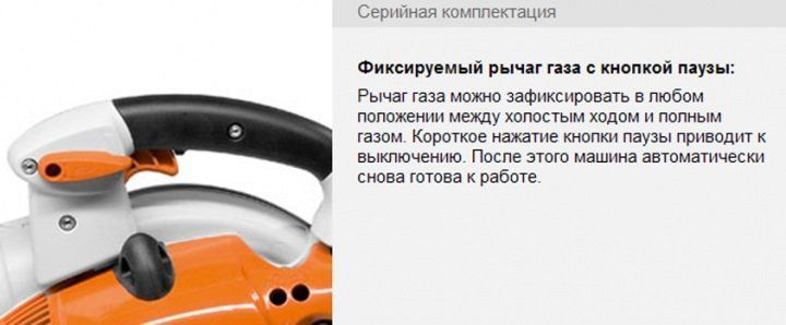 - Фиксируемый рычаг газа с кнопкой паузы