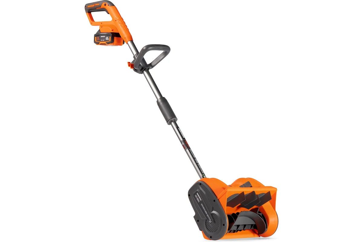 Желоб выброса регулируется вручную с помощью удобной рукоятки, позволяя направлять поток снега в нужную сторону. Несмотря на простоту конструкции, модель отличается практичностью: она не требует топлива и обслуживания двигателя, работает тихо и экологично.